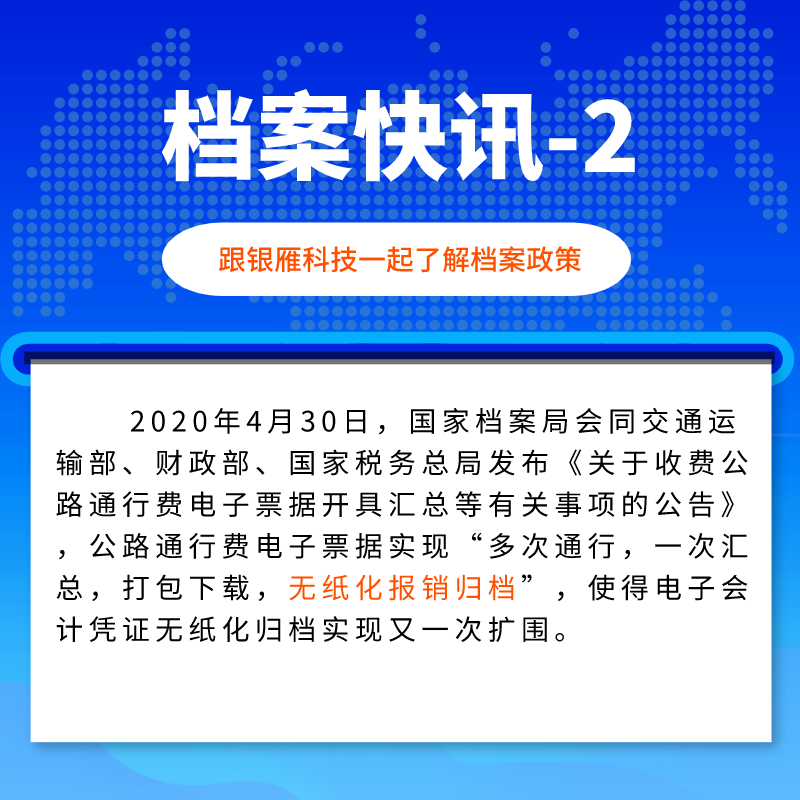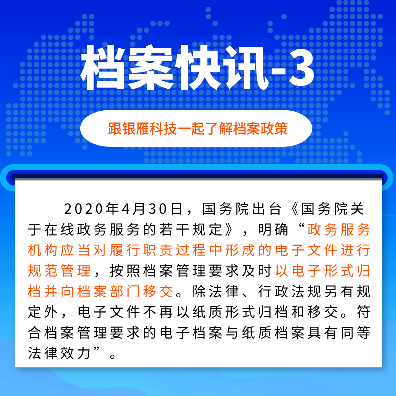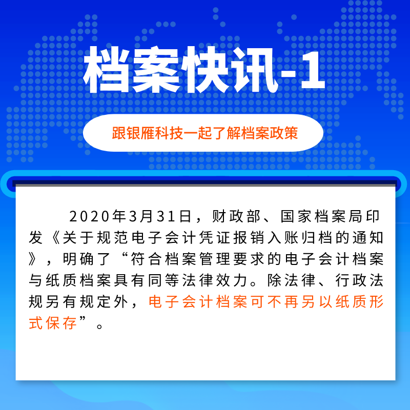 與此同時,為適應電子政務、電子商務的高速發展,國家層面近期出臺了系列通知規定,明確了電子會計憑證、政務服務電子文件的歸檔形式和法律效力,給電子文件的歸檔和電子檔案的管理帶來極大的發展空間。