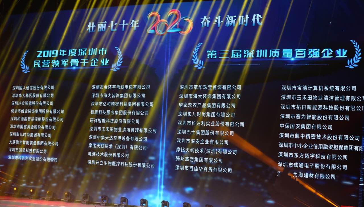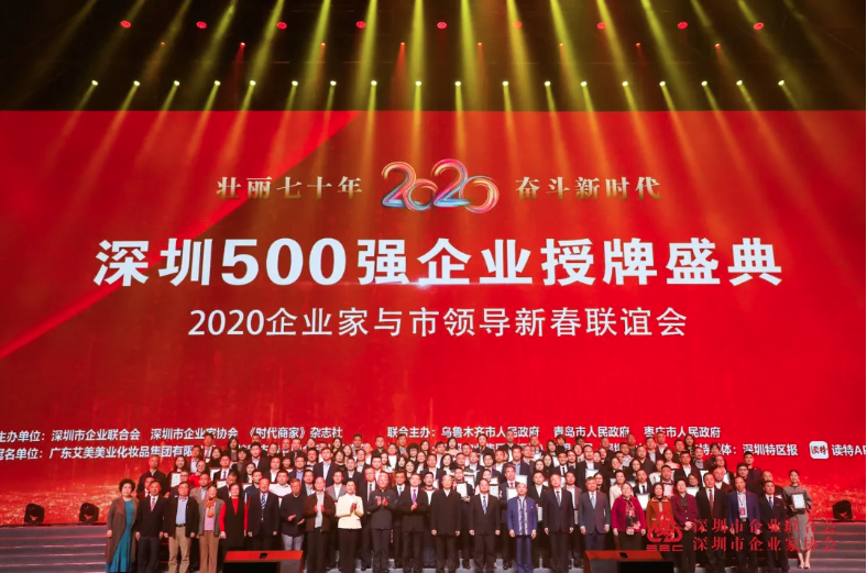 12月10日由深(shen)圳市(shi)企(qi)業(ye)(ye)(ye)聯合會、深(shen)圳市(shi)企(qi)業(ye)(ye)(ye)家協會舉辦(ban)的“壯麗七十年 奮(fen)斗新(xin)時代”——2020企(qi)業(ye)(ye)(ye)家與(yu)市(shi)領導新(xin)春聯誼(yi)會在深(shen)圳春繭體(ti)育中心舉行。聯誼(yi)會現場,市(shi)領導為“2019深(shen)圳500強(qiang)企(qi)業(ye)(ye)(ye)”“2019年深(shen)圳市(shi)民營領軍骨干企(qi)業(ye)(ye)(ye)”“第三屆深(shen)圳質(zhi)量百(bai)強(qiang)企(qi)業(ye)(ye)(ye)”授牌。