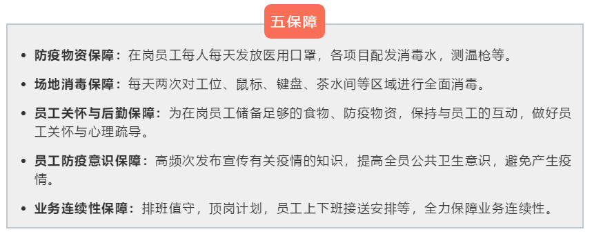 與此同時(shi),在銀雁科(ke)技集團總(zong)(zong)部高(gao)級副總(zong)(zong)裁梁嵐的指揮下(xia),當天(tian)同步成立(li)了集團防(fang)(fang)疫(yi)(yi)應急統(tong)籌小組,并組織(zhi)全國各(ge)分子公(gong)司(si)成立(li)疫(yi)(yi)情防(fang)(fang)控專項工作(zuo)群,所有(you)分子公(gong)司(si)每日進行(xing)防(fang)(fang)疫(yi)(yi)工作(zuo)匯報,所有(you)公(gong)司(si)信息互(hu)通,防(fang)(fang)疫(yi)(yi)策略共享(xiang),共同面對與響應客戶的防(fang)(fang)疫(yi)(yi)協(xie)作(zuo)需求,保障業(ye)務正常進行(xing)。
